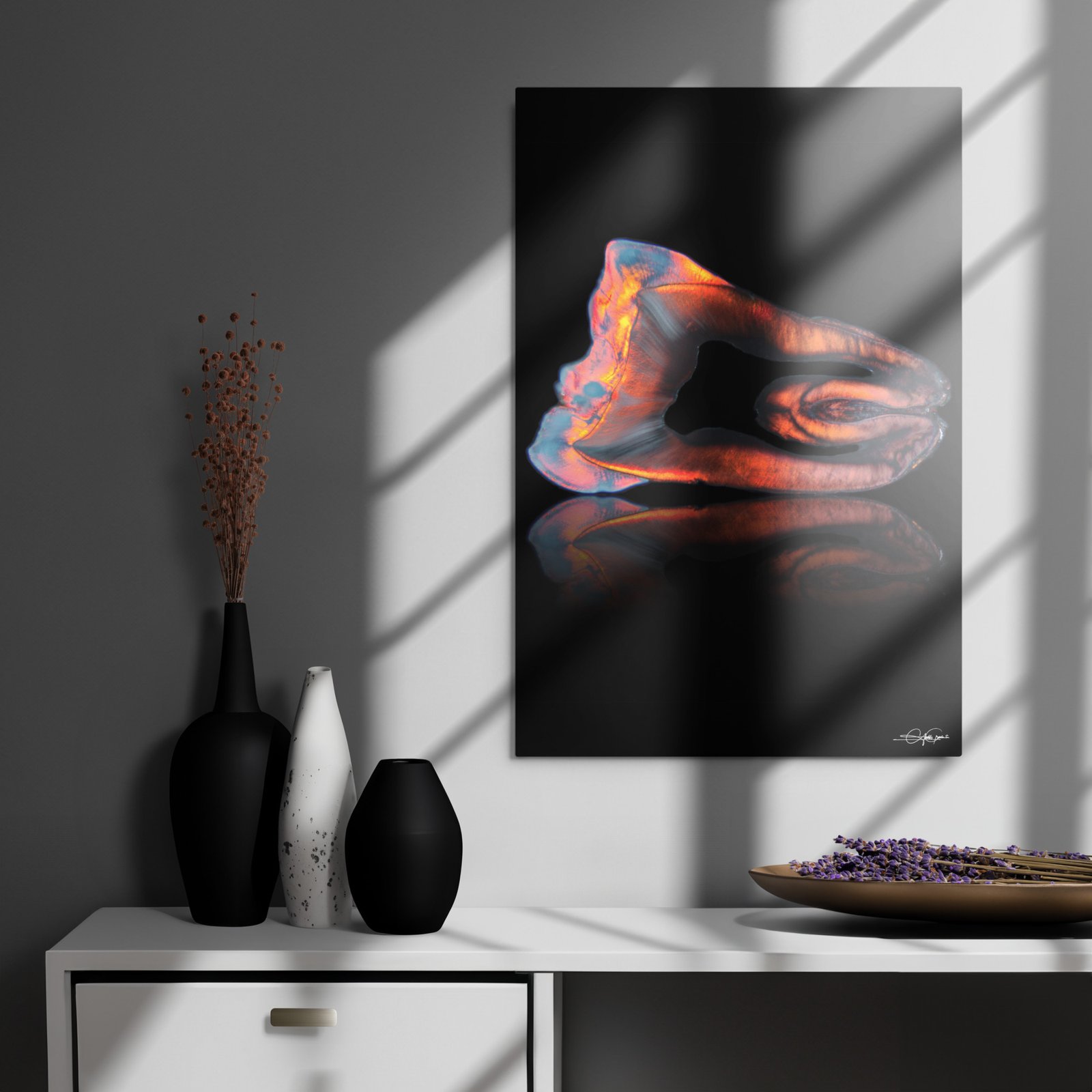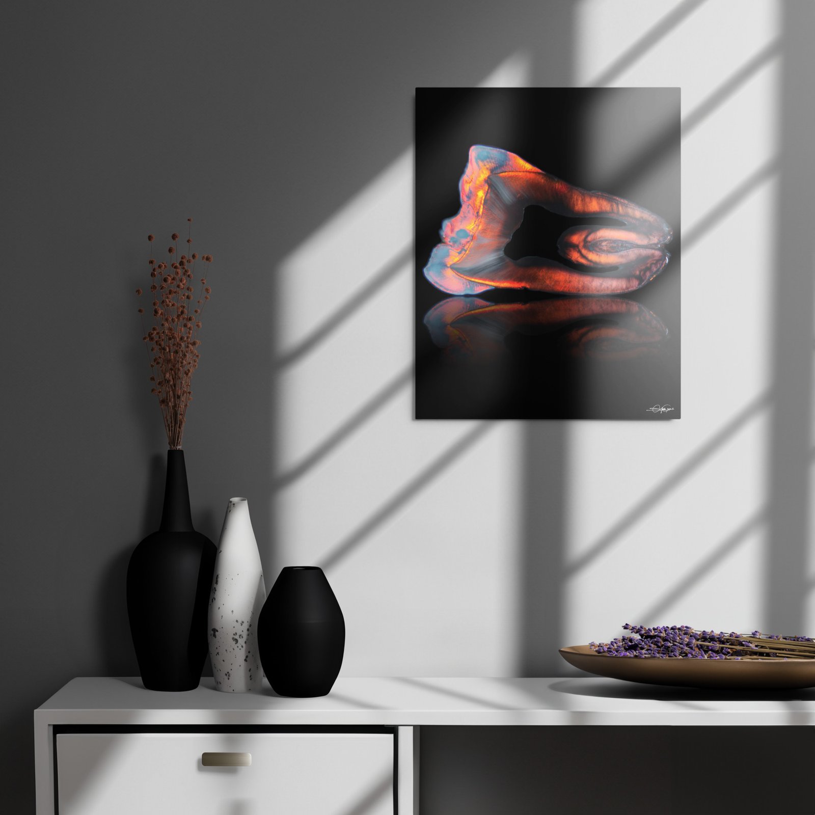This metal print is a dimensional and high-quality piece of art that stands the test of time while remaining easy to clean and care for. The artwork looks luminescent against the wall and the metal base means it’ll last a long time.